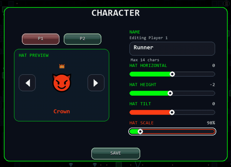 Players can find and unlock Hats they can place and adjust. Customize size, rotation, and placement for both characters. You can input a name here that is used on the scroreboard and in PvP.