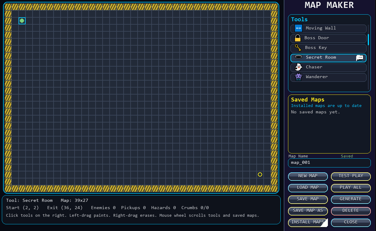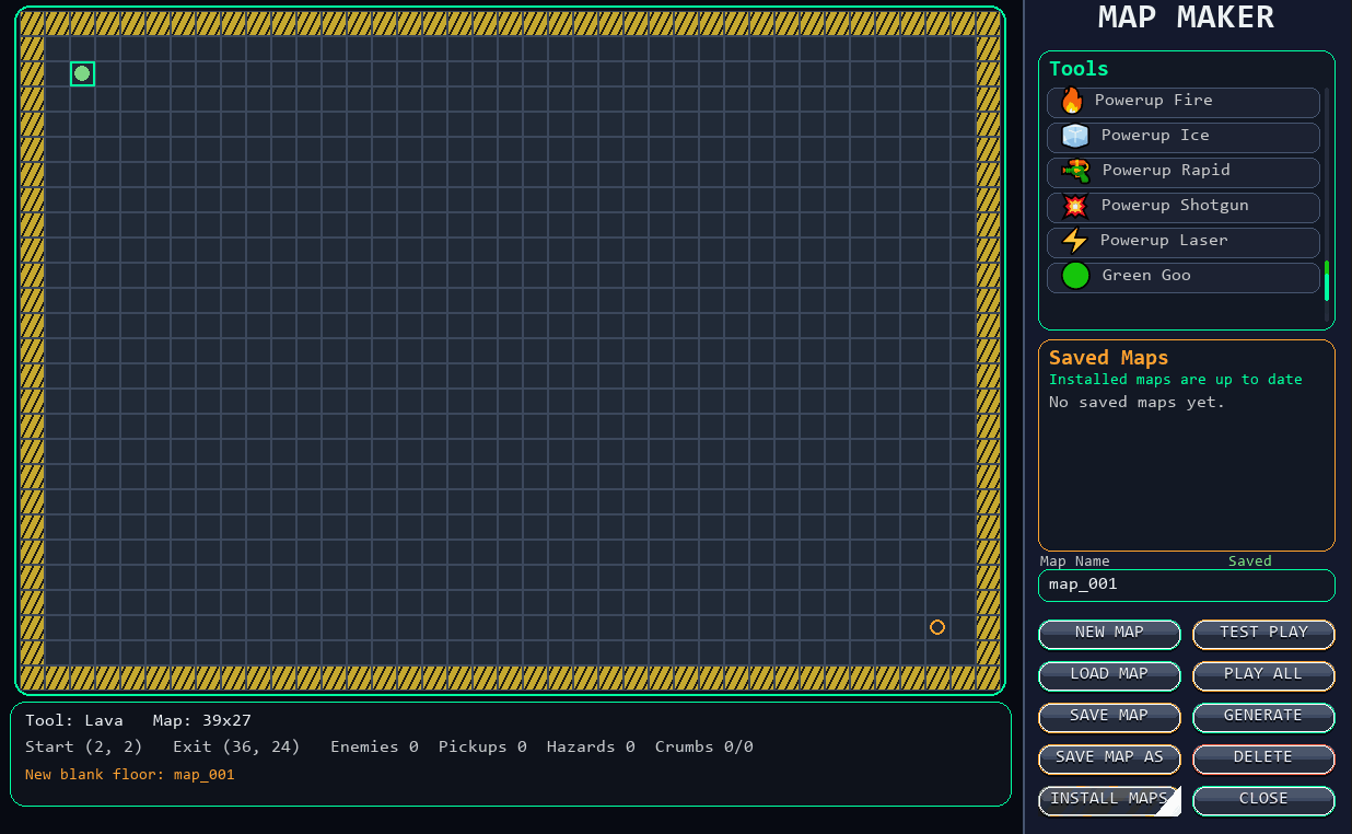 Players can create their own maze Maps and share them with friends using the built-in Map Maker. When you 'Install' the maps into Crum Run they appear at the start of the run. (full version only) Play around and create!