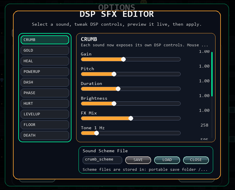 All SFX are generated via DSP, this means you can play with all of the sound options for every sound in the game. You can save the settings, share, or load them. Because everyone has a sound they want to make better.