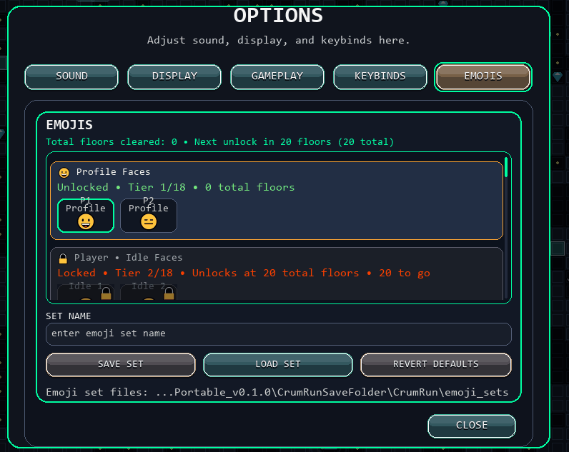 Crum Run uses Emojis as sprites to allow the player to switch the look of the game. You can progress by unlocking Custom Emoji Assignments. When unlocked you can insert your own emojis to the sprites keyframe. Players begin with Profile faces unlocked so that you can change what your character looks like simply by using an emoji. The Emoji picker automatically pops up. The ( Win + . ) Emoji picker.