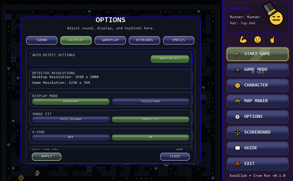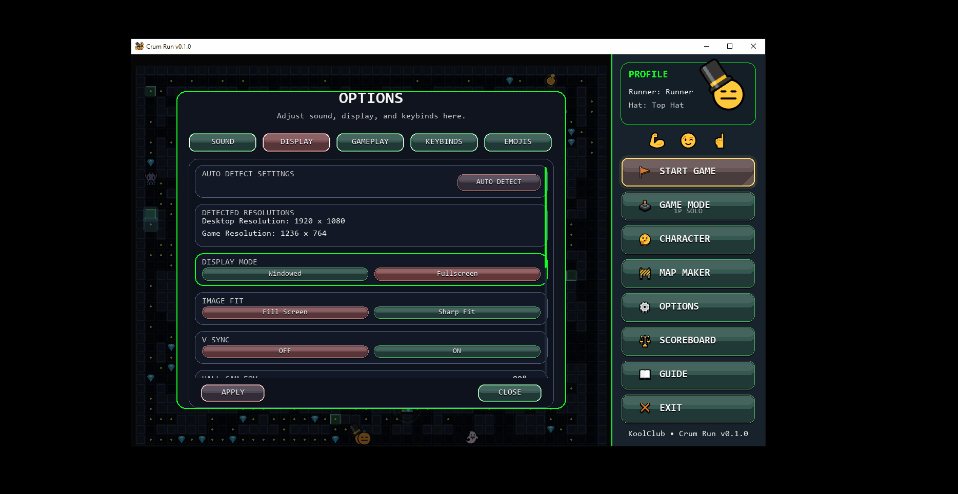 Crum Run boots up in Windowed Mode with a native Game Resolution of 1236x764. It is recommended that you click the full screen button and press auto detect to correctly adjust.